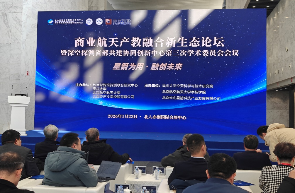 2026年1月23日,重庆大学(教育部深空探测联合研究中心(以下简称深空中心))等单位主办,重庆大学空天科学与技术研究院(以下简称空天院)等单位承办的商业航天产教融合新生态论坛暨深空探测省部共建协同创新中心学术委员会第三次会议在北京经济技术开发区隆重召开。